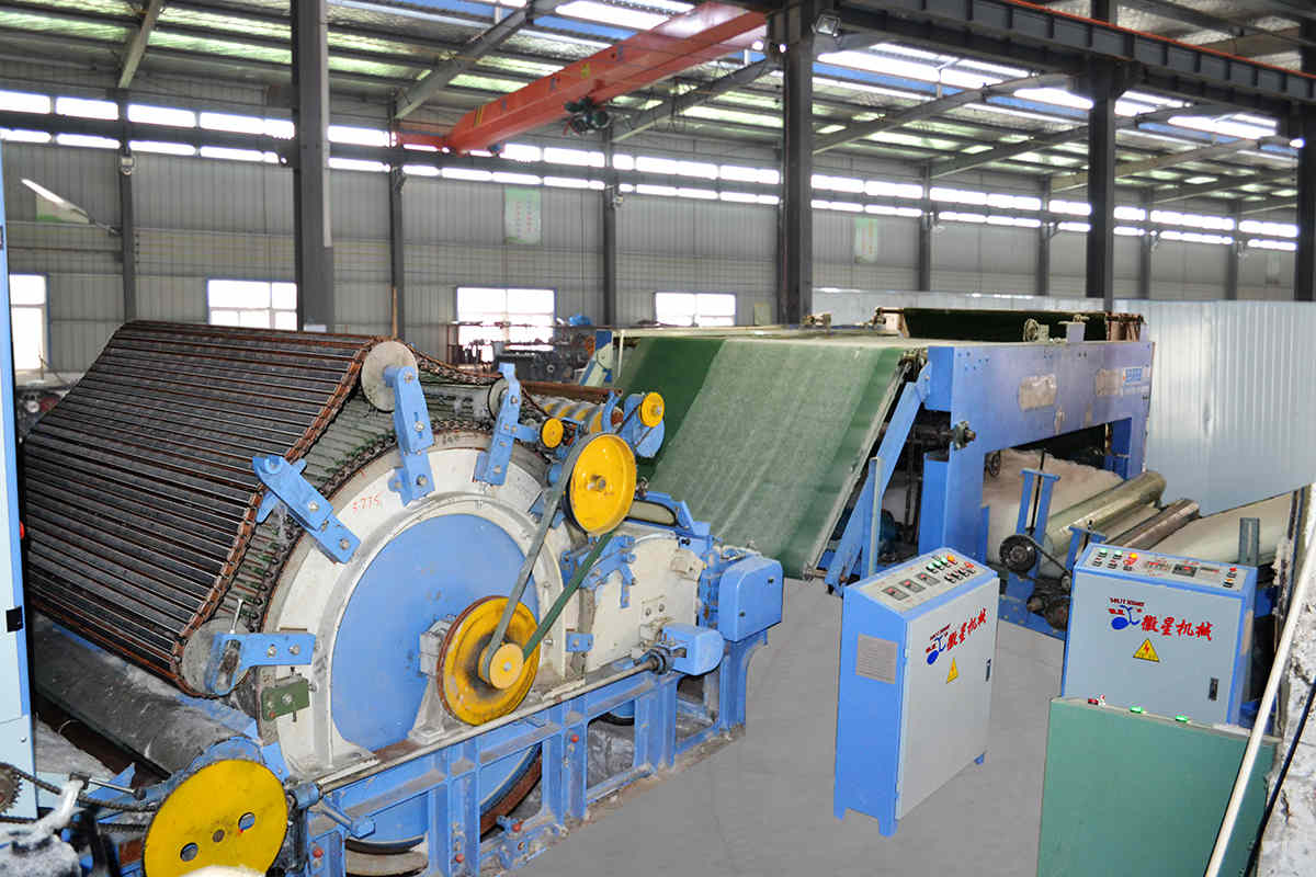 五、磨盤定型運(yùn)棉部分:將棉紗與棉胎纖維磨合粘牢、起球,增加棉胎強(qiáng)度。采用四個平鋪磨盤,將棉胎每面揉磨兩次,使棉胎磨合更牢,起球更多,強(qiáng)度更高。